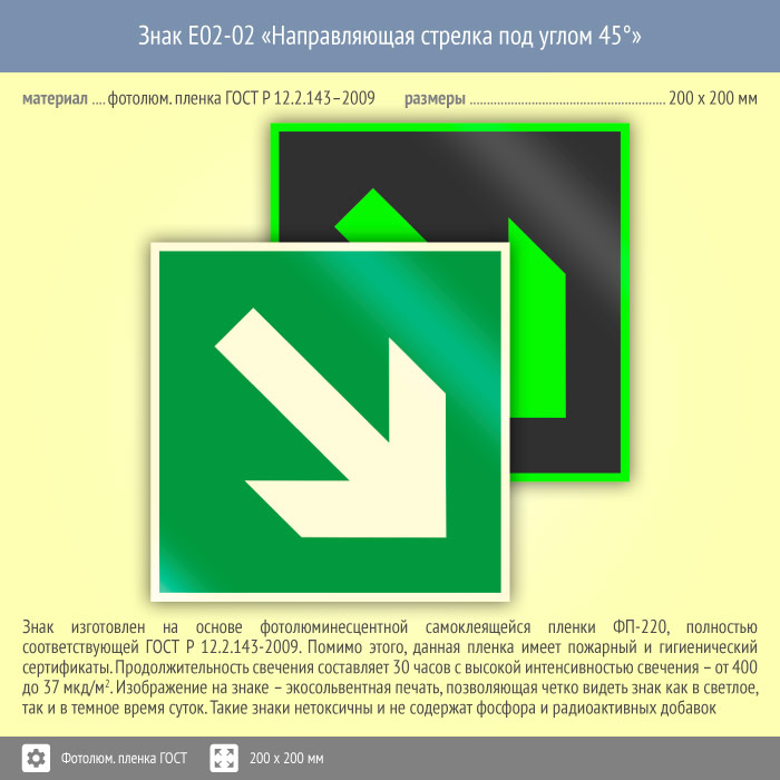 Знак E02-02 «Направляющая стрелка под углом 45°» на фотолюминесцентной пленке по ГОСТ 34428-2018, размером 200х200 мм обозначает направление эвакуации – вниз или наверх. Эвакуационные знаки безопасности изготовлены согласно ГОСТ Р 12.4.026-2015 и предназначены для обозначения направления движения и выходов при эвакуации