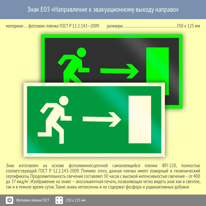 Знак E03 «Направление к эвакуационному выходу направо» на фотолюминесцентной пленке по ГОСТ 34428-2018, размером 250х125 мм обозначает направление эвакуации к выходу в правую сторону. Эвакуационные знаки безопасности изготовлены согласно ГОСТ Р 12.4.026-2015 и предназначены для обозначения направления движения и выходов при эвакуации