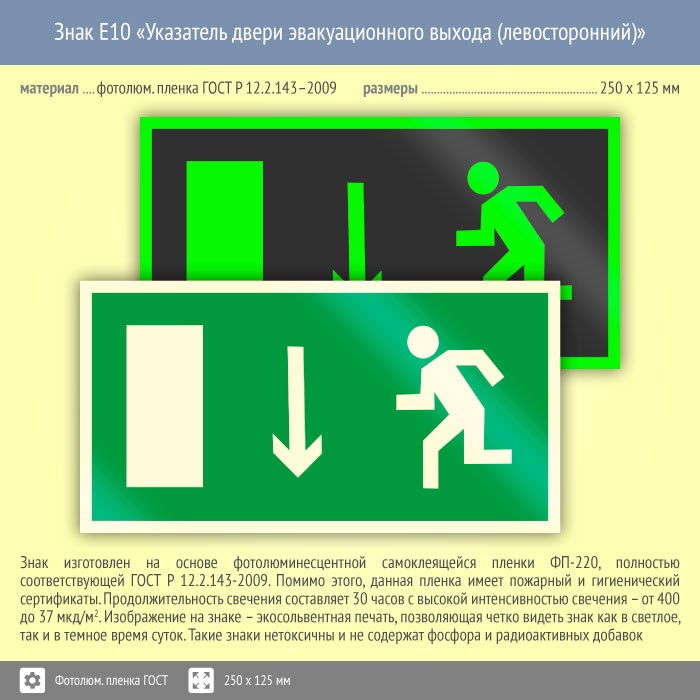 Знак E10 «Указатель двери эвакуационного выхода (левосторонний)» на фотолюминесцентной пленке по ГОСТ 34428-2018, размером 250х125 мм размещается над дверью эвакуационного выхода слева. Эвакуационные знаки безопасности изготовлены согласно ГОСТ Р 12.4.026-2015 и предназначены для обозначения направления движения и выходов при эвакуации