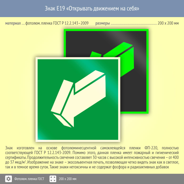 Знак E19 «Открывать движением на себя» на фотолюминесцентной пленке по ГОСТ 34428-2018, размером 200х200 мм указывает направление движения – на себя во время эвакуации. Эвакуационные знаки безопасности изготовлены согласно ГОСТ Р 12.4.026-2015 и предназначены для обозначения направления движения и выходов при эвакуации