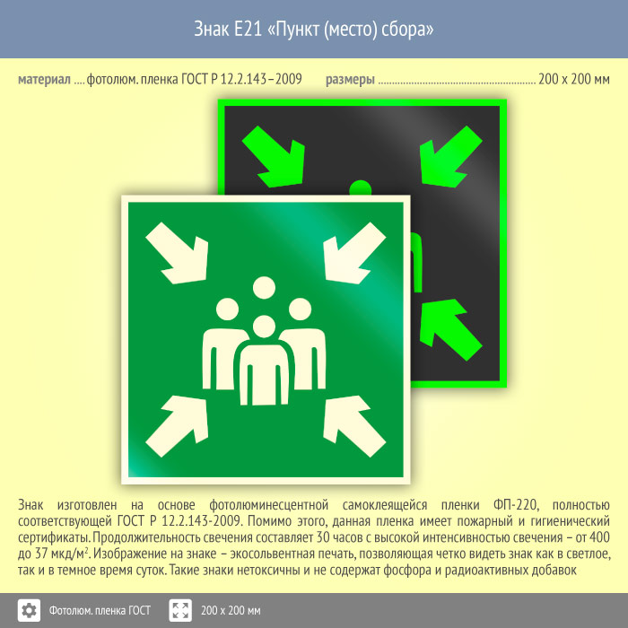 Знак E21 «Пункт (место) сбора» на фотолюминесцентной пленке по ГОСТ 34428-2018, размером 200х200 мм обозначает место и пункт сбора во время эвакуации. Эвакуационные знаки безопасности изготовлены согласно ГОСТ Р 12.4.026-2015 и предназначены для обозначения направления движения и выходов при эвакуации