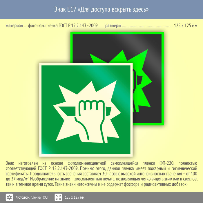 Знак E17 «Для доступа вскрыть здесь» на фотолюминесцентной пленке по ГОСТ 34428-2018, размером 125х125 мм рекомендует в случае эвакуации открыть. Эвакуационные знаки безопасности изготовлены согласно ГОСТ Р 12.4.026-2015 и предназначены для обозначения направления движения и выходов при эвакуации