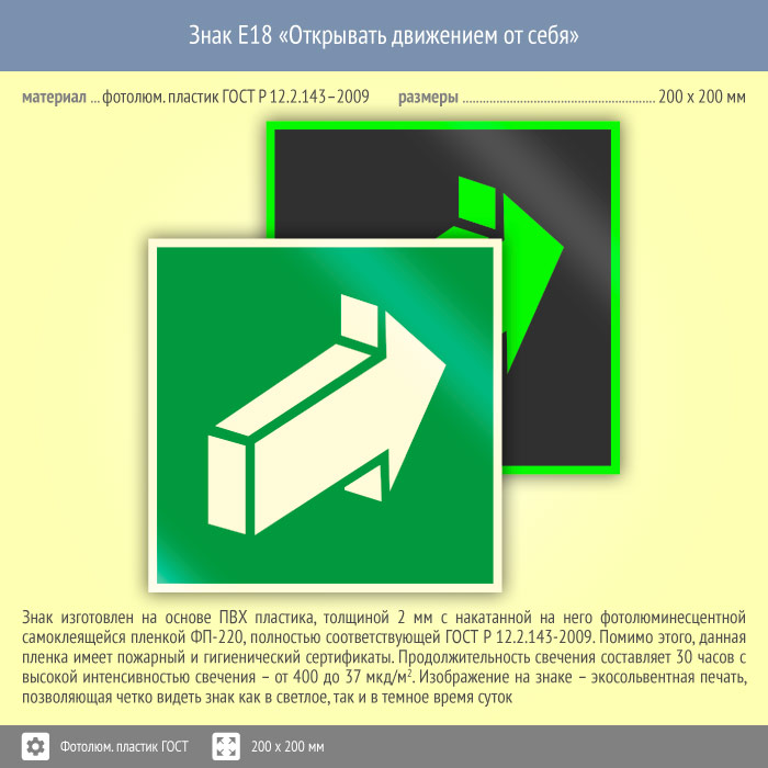 Знак E18 «Открывать движением от себя» на фотолюминесцентном пластике по ГОСТ 34428-2018, размером 200х200 мм указывает направление движения – от себя во время эвакуации. Эвакуационные знаки безопасности изготовлены согласно ГОСТ Р 12.4.026-2015 и предназначены для обозначения направления движения и выходов при эвакуации