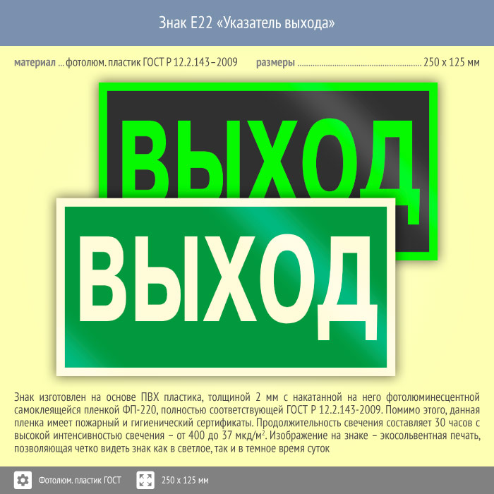 Знак E22 «Указатель выхода» на фотолюминесцентном пластике по ГОСТ 34428-2018, размером 250х125 мм обозначает выход – как во время эвакуации, так и в мирное время. Эвакуационные знаки безопасности изготовлены согласно ГОСТ Р 12.4.026-2015 и предназначены для обозначения направления движения и выходов при эвакуации