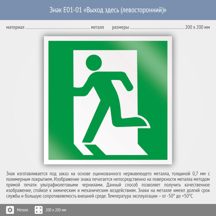 Знак E01-01 «Выход здесь (левосторонний)» на металле, размером 200х200 мм обозначает место выхода – слева. Эвакуационные знаки безопасности изготовлены согласно ГОСТ Р 12.4.026-2015 и предназначены для обозначения направления движения и выходов при эвакуации