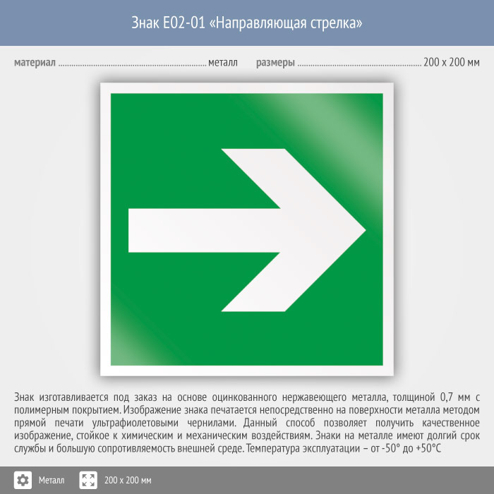 Знак E02-01 «Направляющая стрелка» на металле, размером 200х200 мм обозначает направление эвакуации – вправо или влево. Эвакуационные знаки безопасности изготовлены согласно ГОСТ Р 12.4.026-2015 и предназначены для обозначения направления движения и выходов при эвакуации01