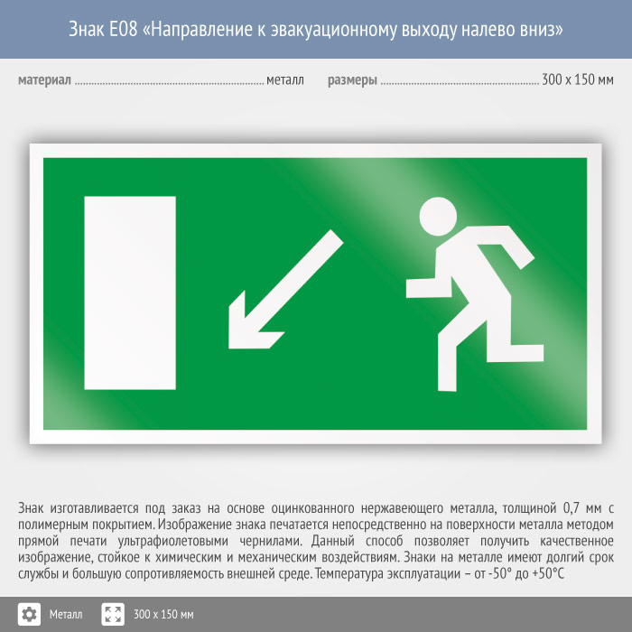 Знак E08 «Направление к эвакуационному выходу налево вниз» на металле, размером 300х150 мм направляет к выходу налево и вниз. Эвакуационные знаки безопасности изготовлены согласно ГОСТ Р 12.4.026-2015 и предназначены для обозначения направления движения и выходов при эвакуации
