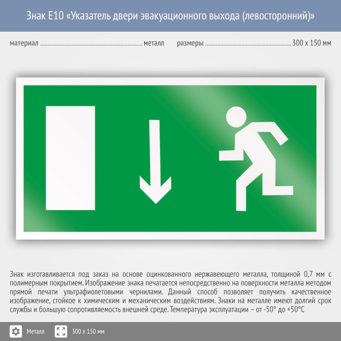 Знак E10 «Указатель двери эвакуационного выхода (левосторонний)» на металле, размером 300х150 мм размещается над дверью эвакуационного выхода слева. Эвакуационные знаки безопасности изготовлены согласно ГОСТ Р 12.4.026-2015 и предназначены для обозначения направления движения и выходов при эвакуации