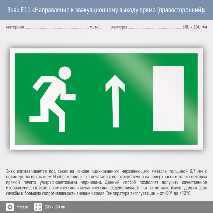 Знак E11 «Направление к эвакуационному выходу прямо (правосторонний)» на металле, размером 300х150 мм указывает направление эвакуации – направо. Эвакуационные знаки безопасности изготовлены согласно ГОСТ Р 12.4.026-2015 и предназначены для обозначения направления движения и выходов при эвакуации