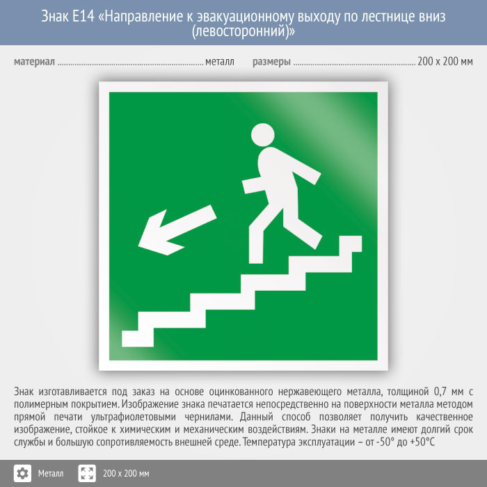 Знак E14 «Направление к эвакуационному выходу по лестнице вниз (левосторонний)» (металл, 200х200 мм)