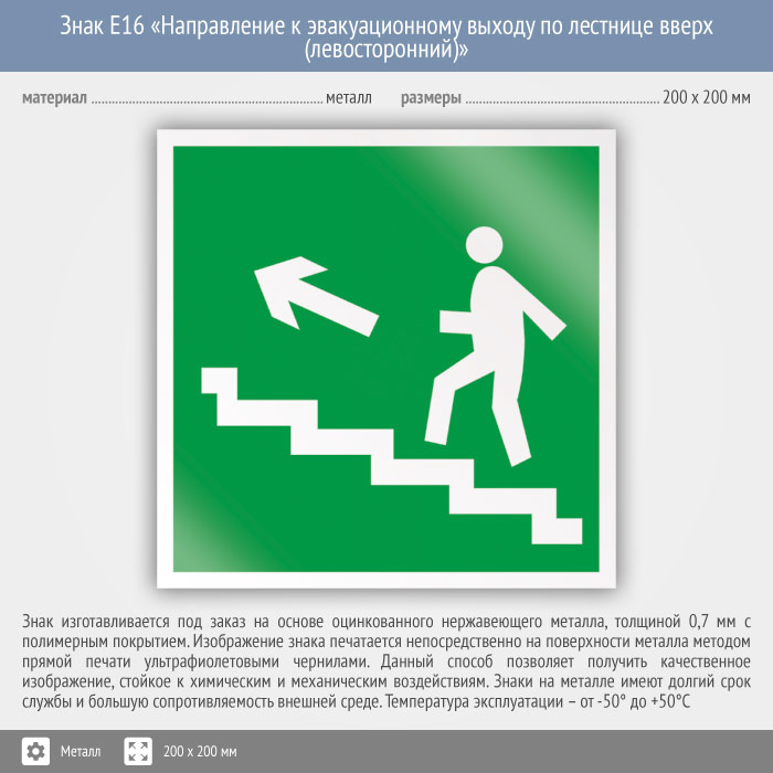 Знак E16 «Направление к эвакуационному выходу по лестнице вверх (левосторонний)» (металл, 200х200 мм)