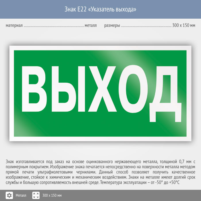 Знак E22 «Указатель выхода» на металле, размером 300х150 мм обозначает выход – как во время эвакуации, так и в мирное время. Эвакуационные знаки безопасности изготовлены согласно ГОСТ Р 12.4.026-2015 и предназначены для обозначения направления движения и выходов при эвакуации