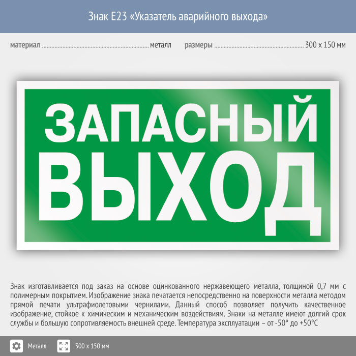 Знак E23 «Указатель запасного выхода» (устаревший) на металле, размером 300х150 мм обозначает, что этот выход является запасным и используется только во время эвакуации. Эвакуационные знаки безопасности изготовлены согласно ГОСТ Р 12.4.026-2015 и предназначены для обозначения направления движения и выходов при эвакуации