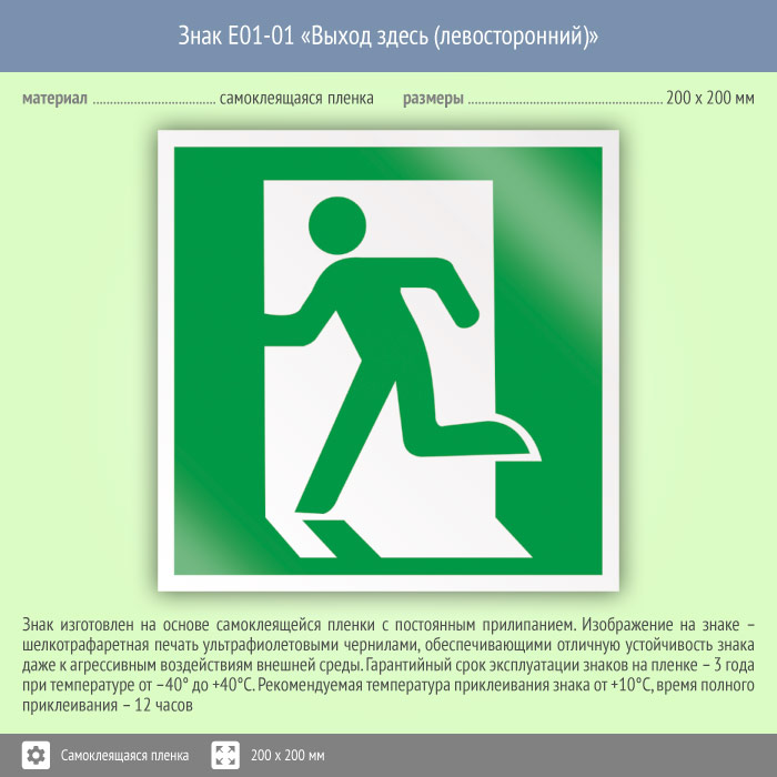 Знак E01-01 «Выход здесь (левосторонний)» на пленке, размером 200х200 мм обозначает место выхода – слева. Эвакуационные знаки безопасности изготовлены согласно ГОСТ Р 12.4.026-2015 и предназначены для обозначения направления движения и выходов при эвакуации