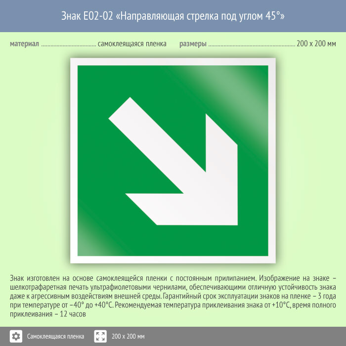 Знак E02-02 «Направляющая стрелка под углом 45°» на пленке, размером 200х200 мм обозначает направление эвакуации – вниз или наверх. Эвакуационные знаки безопасности изготовлены согласно ГОСТ Р 12.4.026-2015 и предназначены для обозначения направления движения и выходов при эвакуации