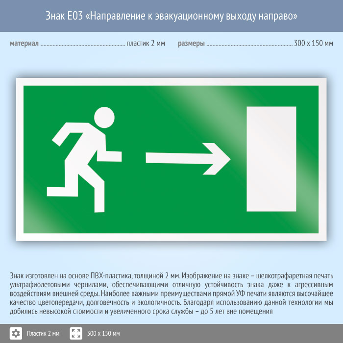 Знак E03 «Направление к эвакуационному выходу направо» на пластике, размером 300х150 мм обозначает направление эвакуации к выходу в правую сторону. Эвакуационные знаки безопасности изготовлены согласно ГОСТ Р 12.4.026-2015 и предназначены для обозначения направления движения и выходов при эвакуации