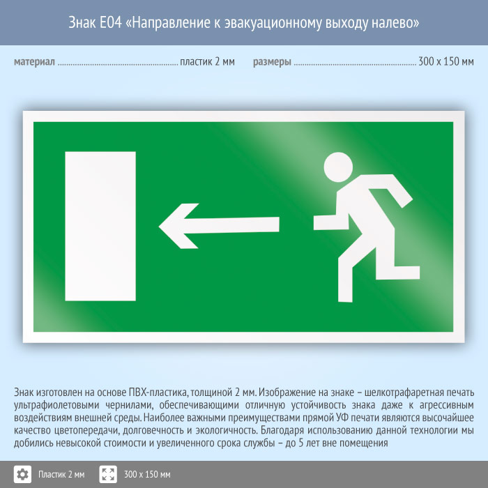 Знак E04 «Направление к эвакуационному выходу налево» на пластике, размером 300х150 мм обозначает направление эвакуации к выходу в левую сторону. Эвакуационные знаки безопасности изготовлены согласно ГОСТ Р 12.4.026-2015 и предназначены для обозначения направления движения и выходов при эвакуации