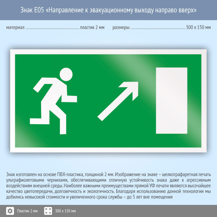 Знак E05 «Направление к эвакуационному выходу направо вверх» на пластике, размером 300х150 мм направляет к выходу направо и наверх. Эвакуационные знаки безопасности изготовлены согласно ГОСТ Р 12.4.026-2015 и предназначены для обозначения направления движения и выходов при эвакуации