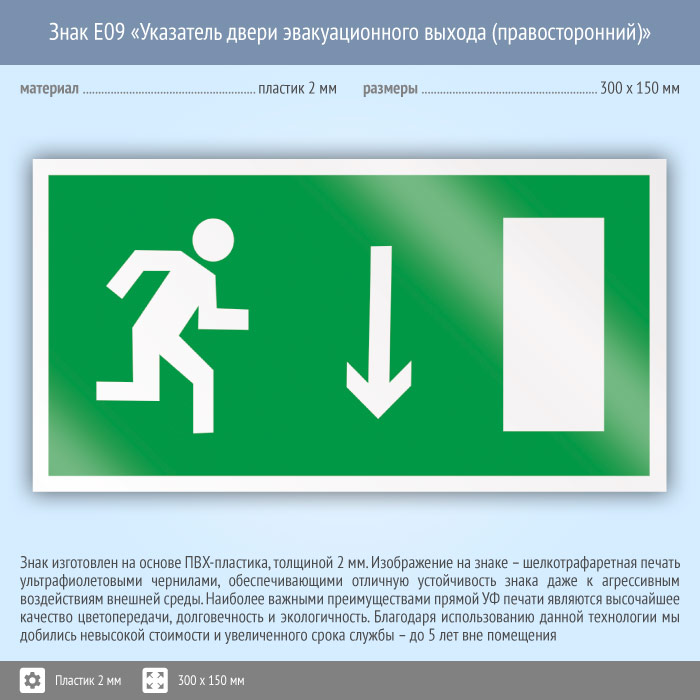 Знак E09 «Указатель двери эвакуационного выхода (правосторонний)» на пластике, размером 300х150 мм размещается над дверью эвакуационного выхода справа. Эвакуационные знаки безопасности изготовлены согласно ГОСТ Р 12.4.026-2015 и предназначены для обозначения направления движения и выходов при эвакуации