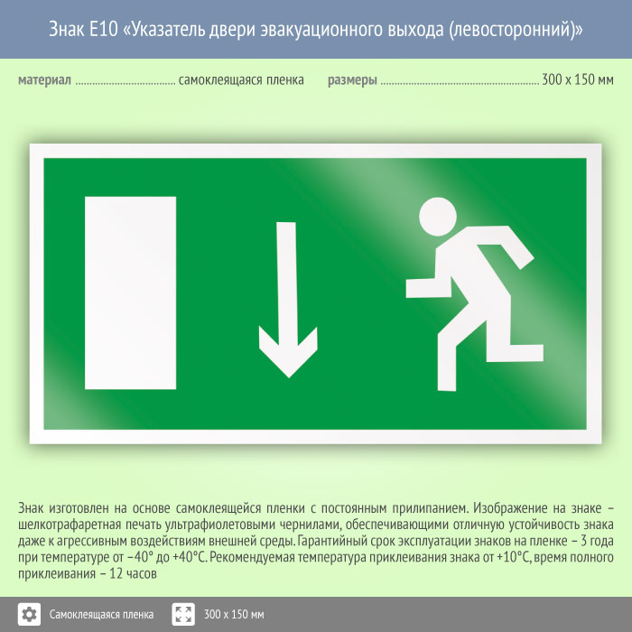 Знак E10 «Указатель двери эвакуационного выхода (левосторонний)» на пленке, размером 300х150 мм размещается над дверью эвакуационного выхода слева. Эвакуационные знаки безопасности изготовлены согласно ГОСТ Р 12.4.026-2015 и предназначены для обозначения направления движения и выходов при эвакуации