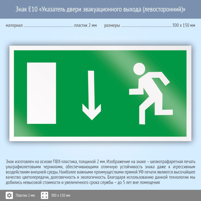 Знак E10 «Указатель двери эвакуационного выхода (левосторонний)» на пластике, размером 300х150 мм размещается над дверью эвакуационного выхода слева. Эвакуационные знаки безопасности изготовлены согласно ГОСТ Р 12.4.026-2015 и предназначены для обозначения направления движения и выходов при эвакуации