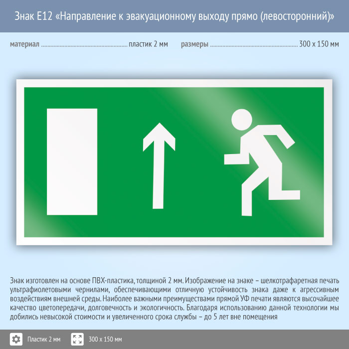 Знак E12 «Направление к эвакуационному выходу прямо (левосторонний)» на пластике, размером 300х150 мм указывает направление эвакуации – налево. Эвакуационные знаки безопасности изготовлены согласно ГОСТ Р 12.4.026-2015 и предназначены для обозначения направления движения и выходов при эвакуации
