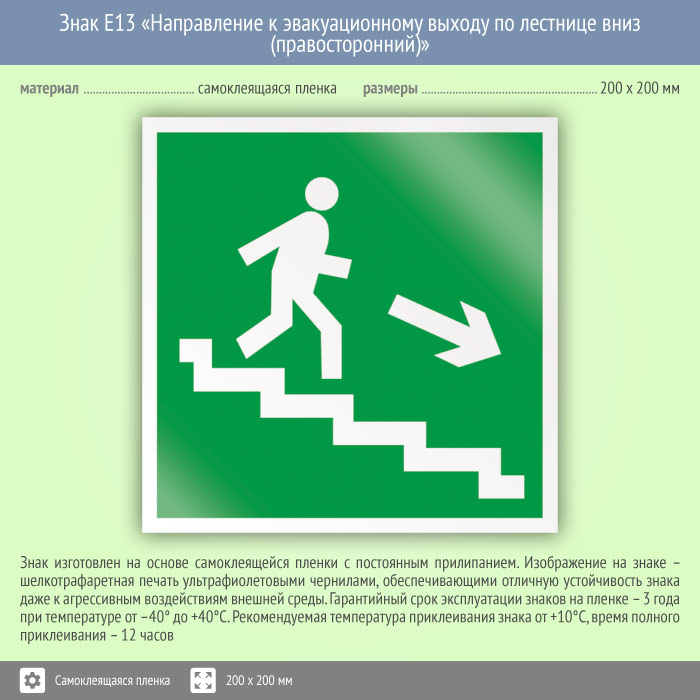 Знак E13 «Направление к эвакуационному выходу по лестнице вниз (правосторонний)» на пленке, размером 200х200 мм указывает направление к выходу вниз по лестнице вправо. Эвакуационные знаки безопасности изготовлены согласно ГОСТ Р 12.4.026-2015 и предназначены для обозначения направления движения и выходов при эвакуации