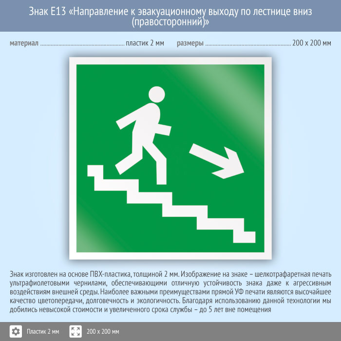 Знак E13 «Направление к эвакуационному выходу по лестнице вниз (правосторонний)» на пластике, размером 200х200 мм указывает направление к выходу вниз по лестнице вправо. Эвакуационные знаки безопасности изготовлены согласно ГОСТ Р 12.4.026-2015 и предназначены для обозначения направления движения и выходов при эвакуации