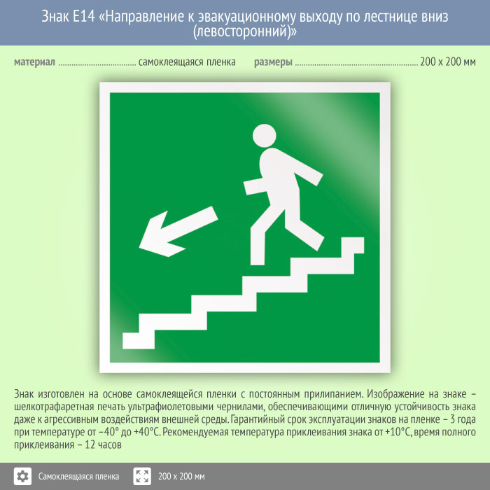Знак E14 «Направление к эвакуационному выходу по лестнице вниз (левосторонний)» на пленке, размером 200х200 мм указывает направление к выходу вниз по лестнице влево. Эвакуационные знаки безопасности изготовлены согласно ГОСТ Р 12.4.026-2015 и предназначены для обозначения направления движения и выходов при эвакуации