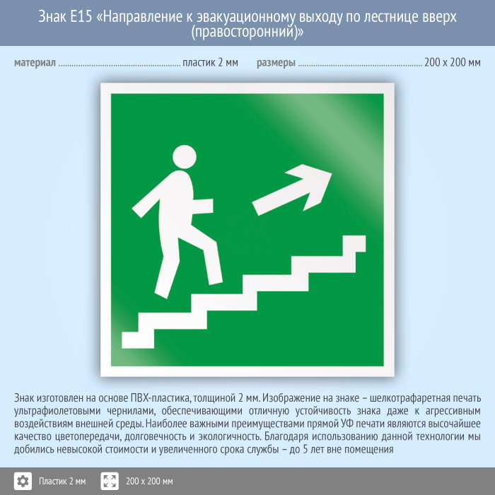 Знак E15 «Направление к эвакуационному выходу по лестнице вверх (правосторонний)» на пластике, размером 200х200 мм указывает направление к выходу вверх по лестнице вправо. Эвакуационные знаки безопасности изготовлены согласно ГОСТ Р 12.4.026-2015 и предназначены для обозначения направления движения и выходов при эвакуации