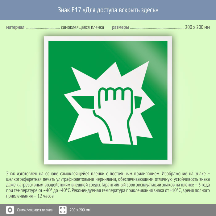 Знак E17 «Для доступа вскрыть здесь» на пленке, размером 200х200 мм рекомендует в случае эвакуации открыть. Эвакуационные знаки безопасности изготовлены согласно ГОСТ Р 12.4.026-2015 и предназначены для обозначения направления движения и выходов при эвакуации