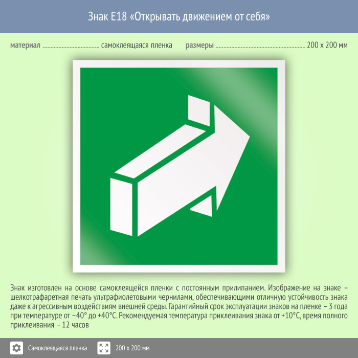 Знак E18 «Открывать движением от себя» на пленке, размером 200х200 мм указывает направление движения – от себя во время эвакуации. Эвакуационные знаки безопасности изготовлены согласно ГОСТ Р 12.4.026-2015 и предназначены для обозначения направления движения и выходов при эвакуации