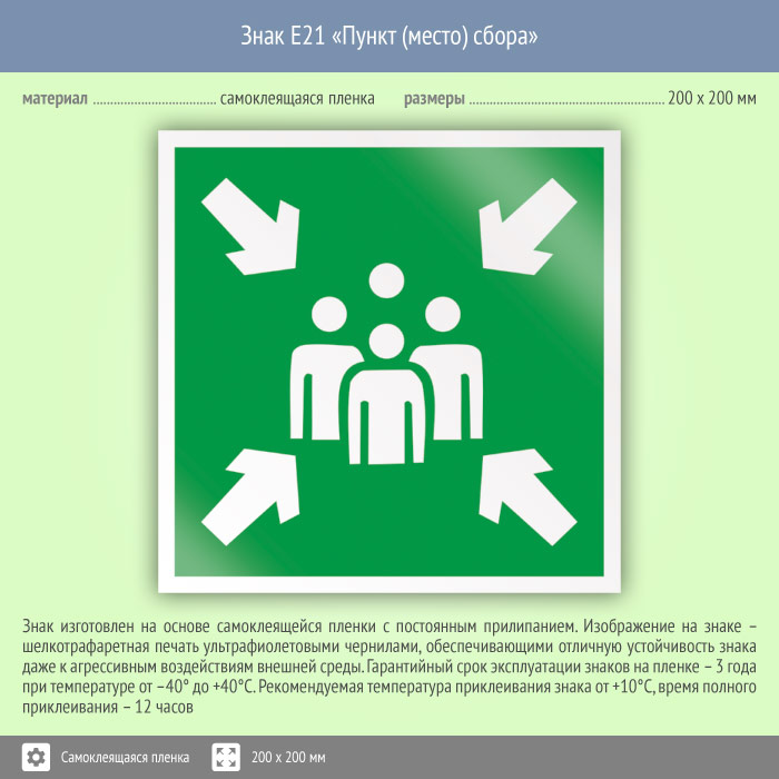 Знак E21 «Пункт (место) сбора» на пленке, размером 200х200 мм обозначает место и пункт сбора во время эвакуации. Эвакуационные знаки безопасности изготовлены согласно ГОСТ Р 12.4.026-2015 и предназначены для обозначения направления движения и выходов при эвакуации