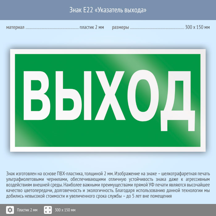 Знак E22 «Указатель выхода» на пластике, размером 300х150 мм обозначает выход – как во время эвакуации, так и в мирное время. Эвакуационные знаки безопасности изготовлены согласно ГОСТ Р 12.4.026-2015 и предназначены для обозначения направления движения и выходов при эвакуации