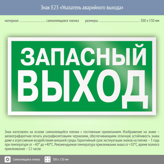Знак E23 «Указатель запасного выхода» (устаревший) на пленке, размером 300х150 мм обозначает, что этот выход является запасным и используется только во время эвакуации. Эвакуационные знаки безопасности изготовлены согласно ГОСТ Р 12.4.026-2015 и предназначены для обозначения направления движения и выходов при эвакуации