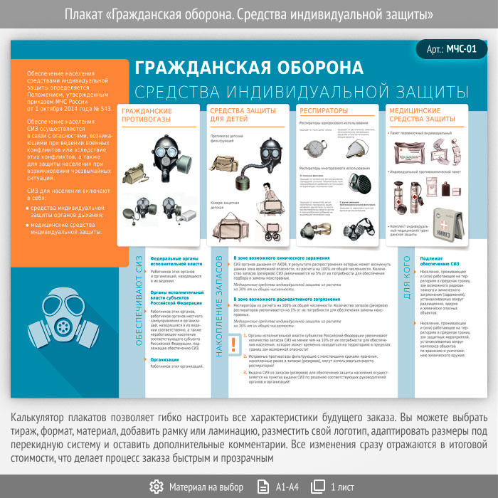 Плакат «Гражданская оборона. Средства индивидуальной защиты» (МЧС-01) содержит информацию о различных СИЗ.