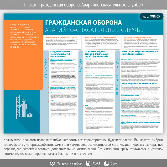 Плакат «Гражданская оборона. Аварийно-спасательные службы» (МЧС-03) содержит информацию об АСС.