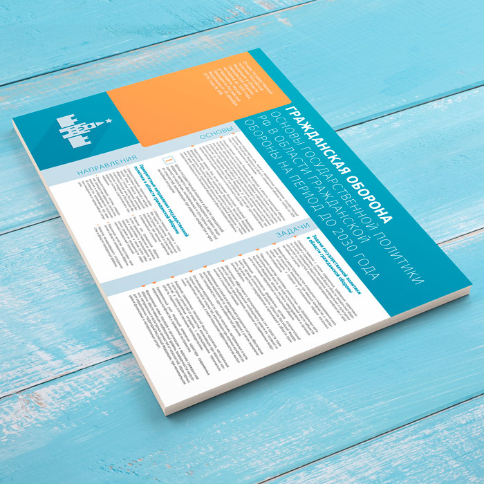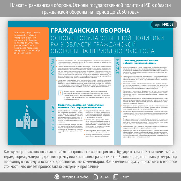 Плакат «Гражданская оборона. Основы государственной политики РФ в области гражданской обороны на период до 2030 года» (МЧС-05) содержит информацию об основах государственной политики РФ в области ГО до 2030 года.