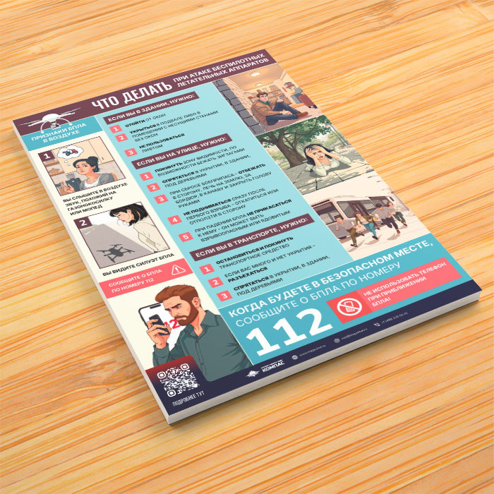Плакат «БПЛА. Действия при обнаружении» с QR (М-135) — это наглядная инструкция по поведению при угрозе атаки беспилотных летательных аппаратов. Содержит признаки присутствия дрона в воздухе, чёткие рекомендации для людей, находящихся на улице, в транспорте и в зданиях, а также правила укрытия и экстренного реагирования. Рекомендуется для размещения в общественных местах, учреждениях, на объектах инфраструктуры и в жилых домах.