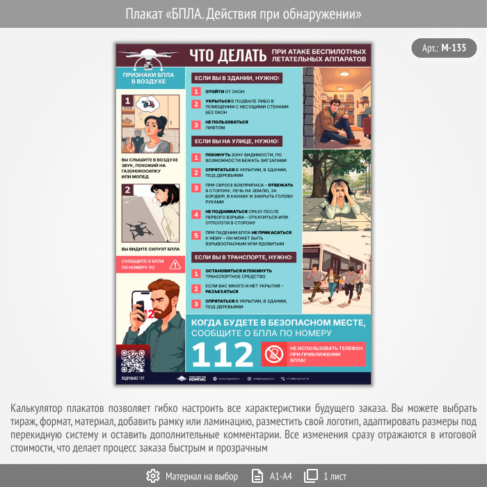 Плакат «БПЛА. Действия при обнаружении» с QR (М-135, 1 лист)