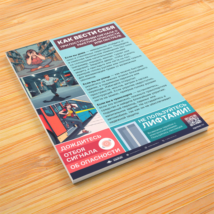 Плакат «Как вести себя при поступлении сигнала о ракетной опасности или обстреле» с QR (М-140) — это наглядная инструкция, которая поможет сохранить жизнь в критической ситуации. Он чётко объясняет действия дома, на улице и в транспорте, повышая шансы на безопасность при внезапной угрозе.