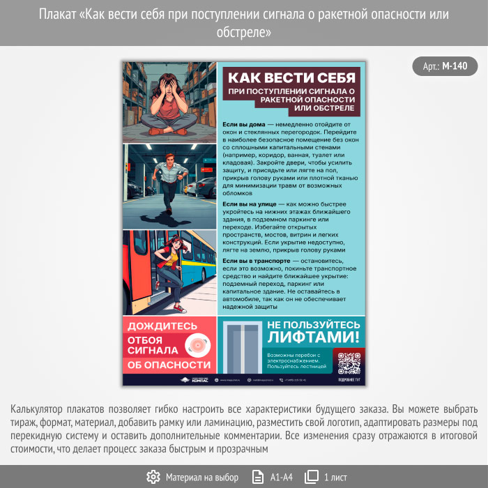 Плакат «Как вести себя при поступлении сигнала о ракетной опасности или обстреле» с QR (М-140, 1 лист)