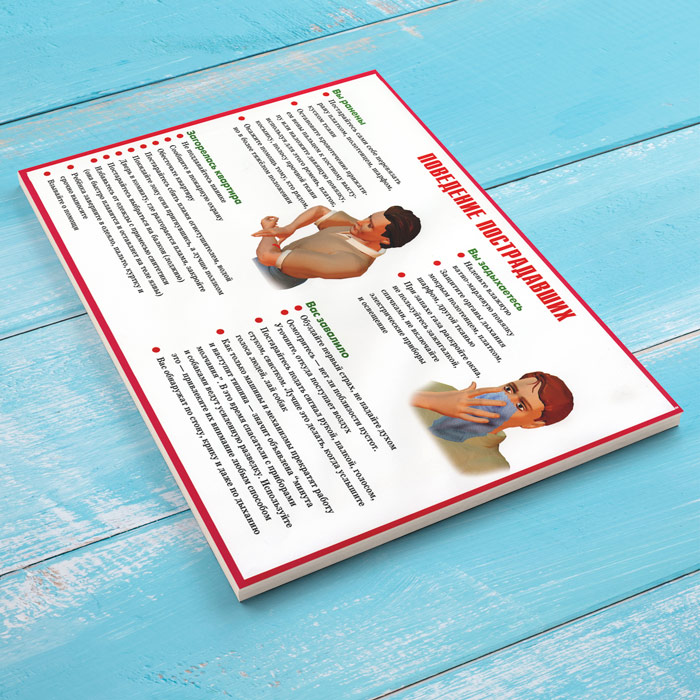 - Плакат «Поведение пострадавших» – что делать, если Вы ранены, задыхаетесь, у Вас загорелась квартира или Вас завалило