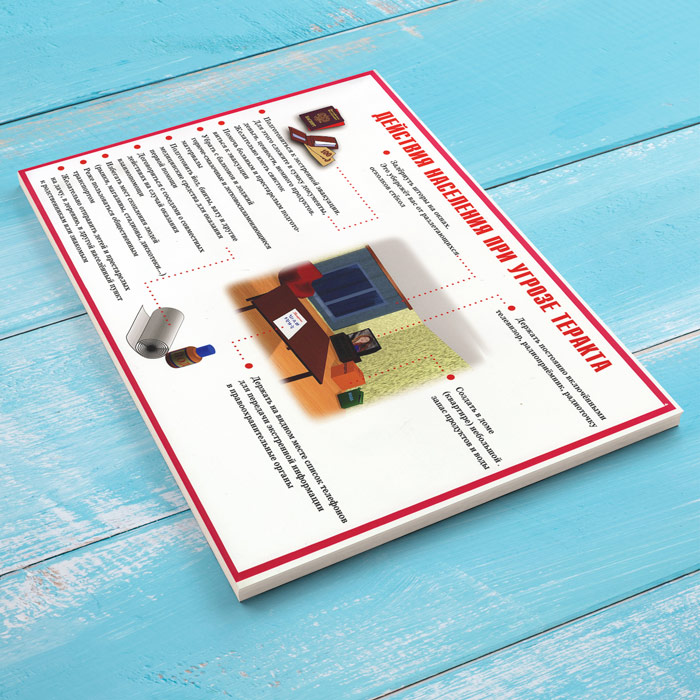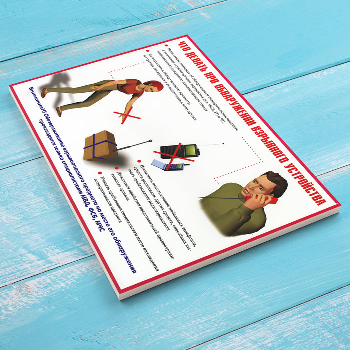 - Плакат «Признаки наличия взрывных устройств» – описание и действия при обнаружении подозрительного предмета