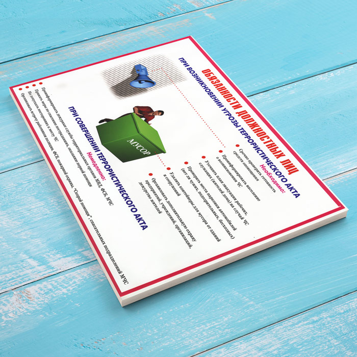 - Плакат «Обязанности должностных лиц» – при возникновении угрозы террористического акта и при его совершении