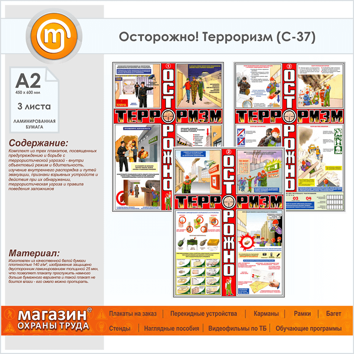 Плакаты «Осторожно! Терроризм» (С-37, ламинированная бумага, А2, 3 листа)