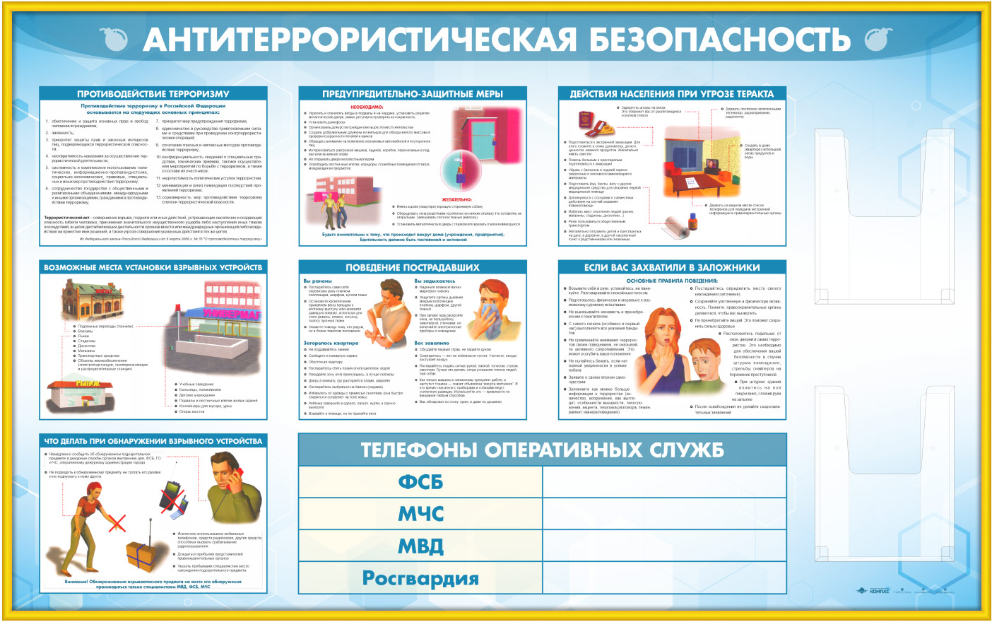 Стенд «Антитеррористическая безопасность» с 2-мя глубокими А4 карманами - это важнейшая информация о необходимых действиях по выявлению готовящегося теракта и о том, как себя вести в случае террористического акта