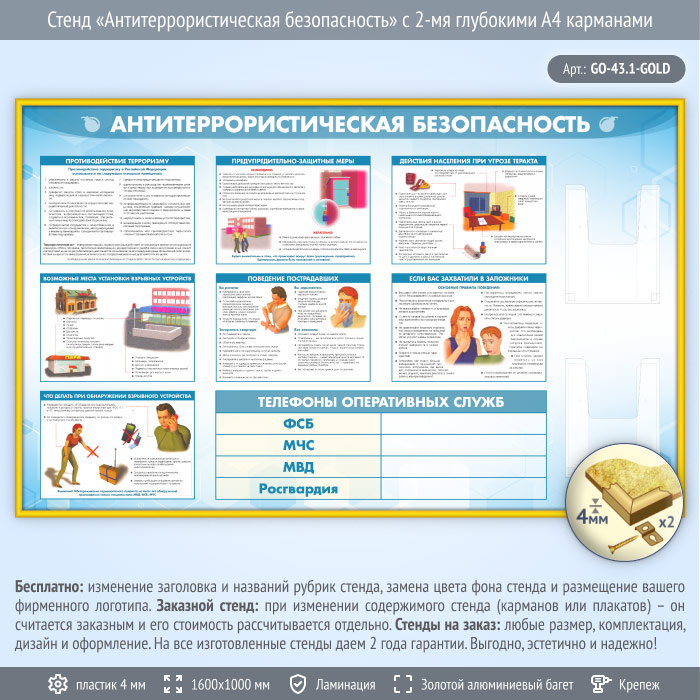Стенд «Антитеррористическая безопасность» с 2-мя глубокими А4 карманами (GO-43.1-GOLD)