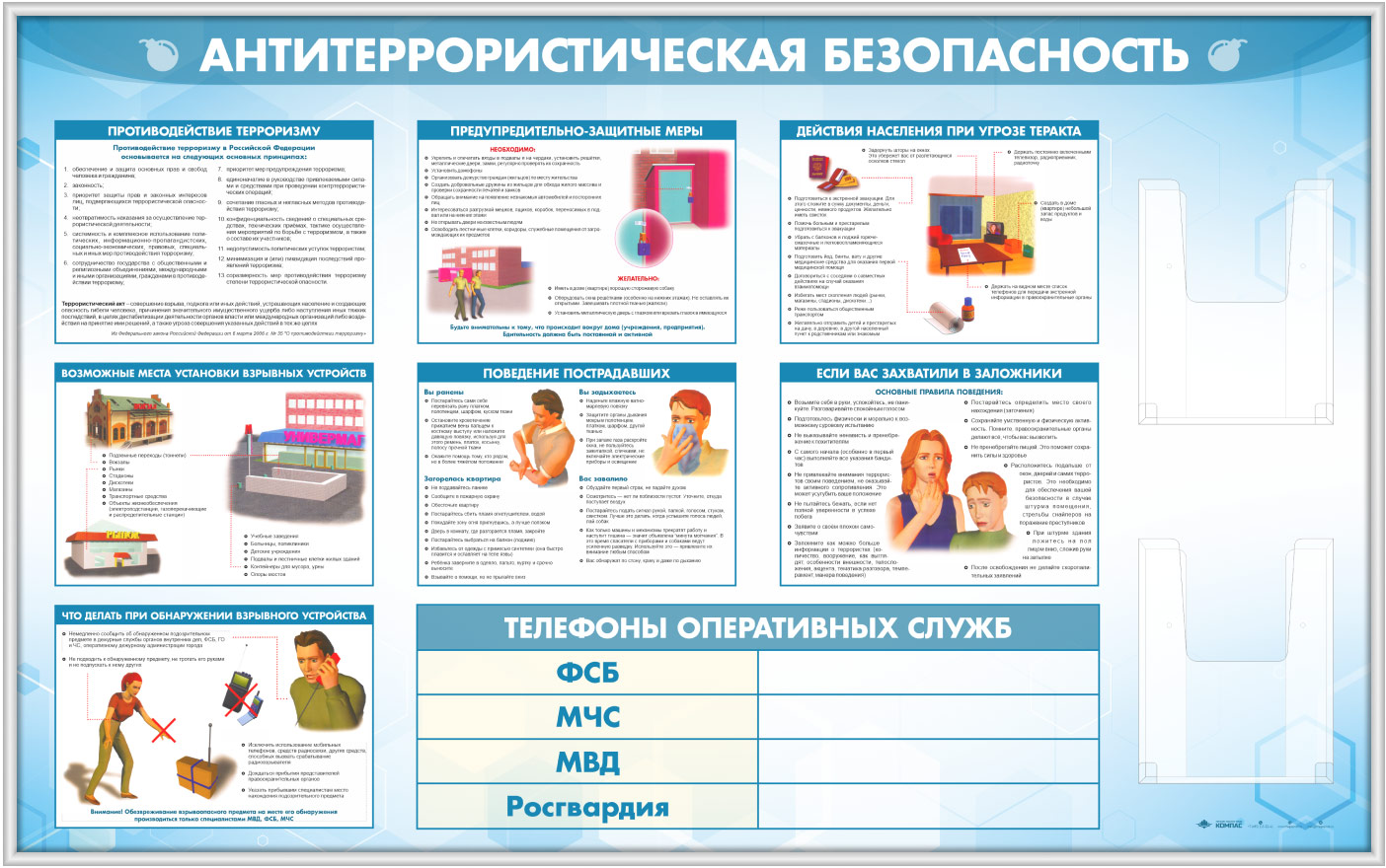 Стенд «Антитеррористическая безопасность» с 2-мя глубокими А4 карманами - это важнейшая информация о необходимых действиях по выявлению готовящегося теракта и о том, как себя вести в случае террористического акта