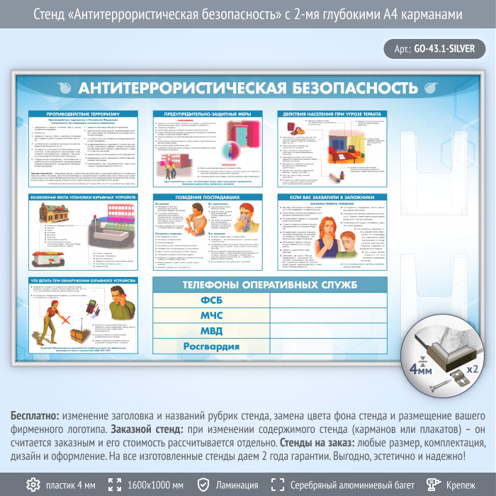 Стенд «Антитеррористическая безопасность» с 2-мя глубокими А4 карманами (GO-43.1-SILVER)